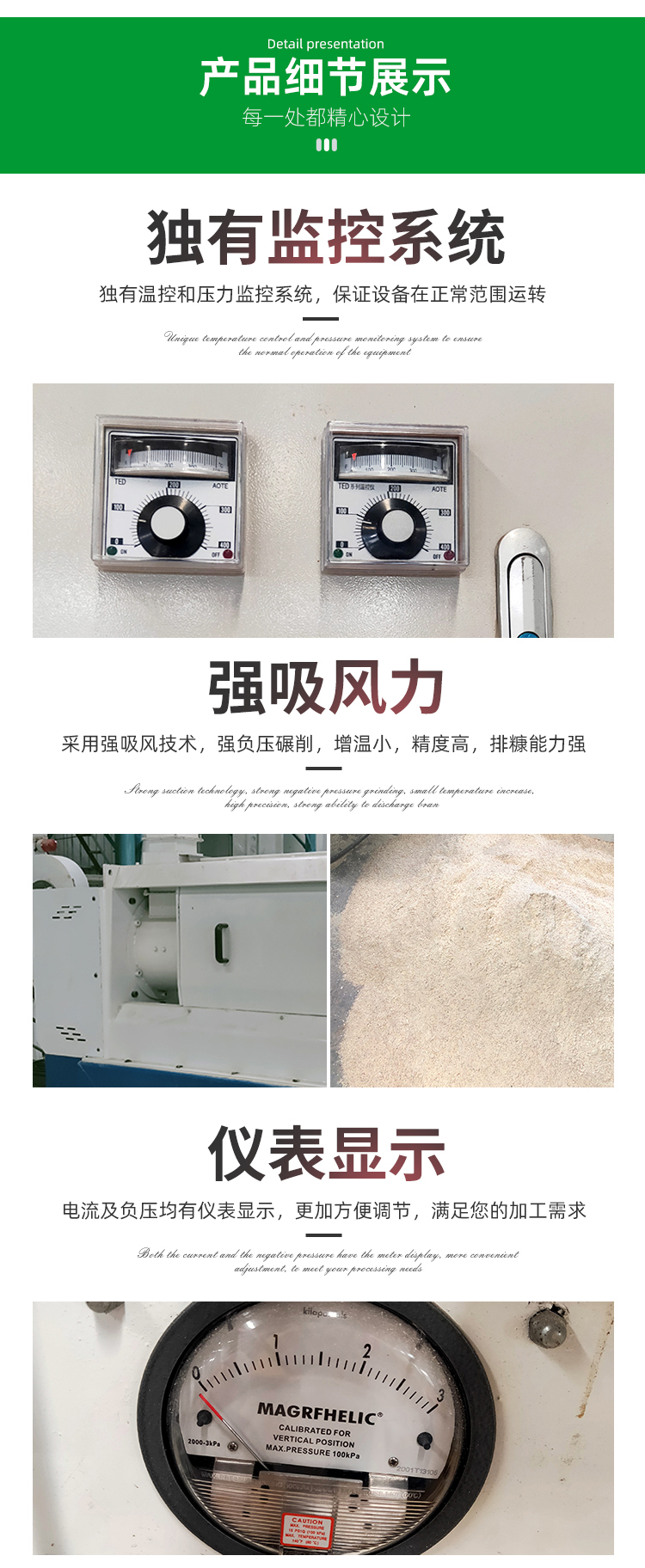 2、采用強吸風(fēng)技術(shù),強負壓碾削,增溫小,精度高,排糠能力強;
