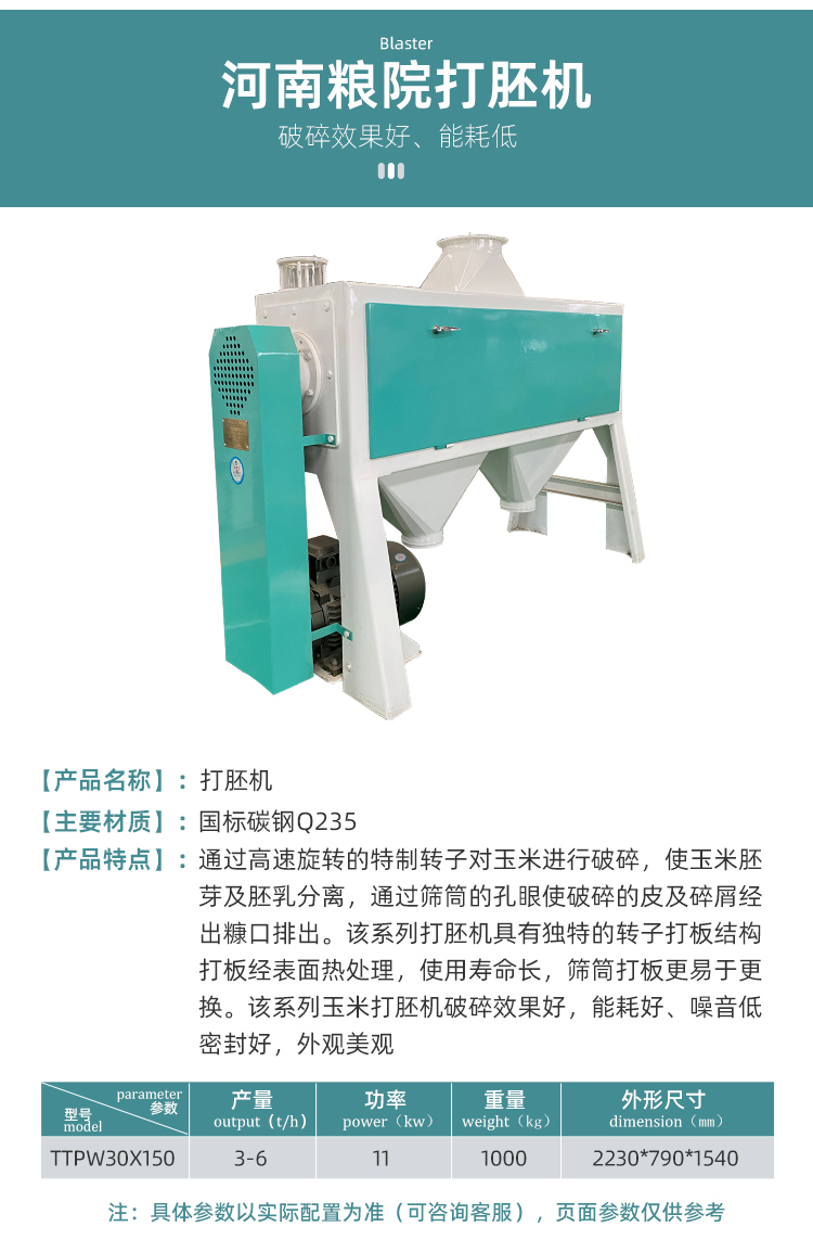 TTPW系列臥式玉米打胚機通過高速旋轉的特制轉子對玉米進行破碎,使玉米胚芽及胚乳分離,通過篩筒的孔眼使破碎的皮及碎屑經出糠扣排出。該系列打胚機具有獨特的轉子打板結構,打板經表面熱處理,使用壽命長,篩筒打板更易于更換。該系列玉米打胚機破碎效果好,能耗低、噪音低、密封性能好、外形美觀。