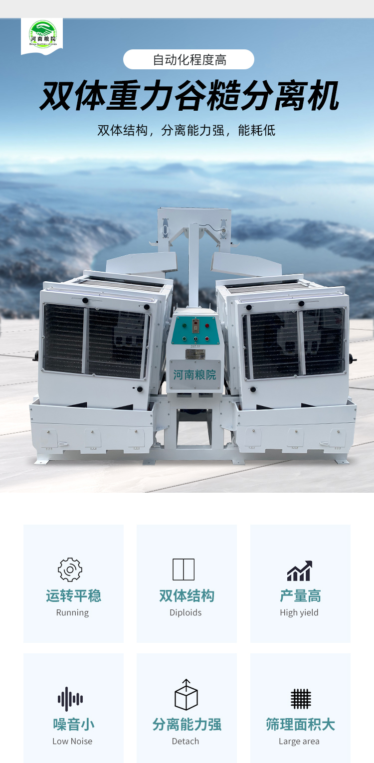 : 雙體重力谷糙分離器采用雙體結構,運轉平穩,平衡效果好,性能穩定,噪音小,能耗低,單位篩理面積大,產量高。自動化程度高,操作方便可靠。分離能力強,使用范圍廣。堅固耐用,可靠少維修。