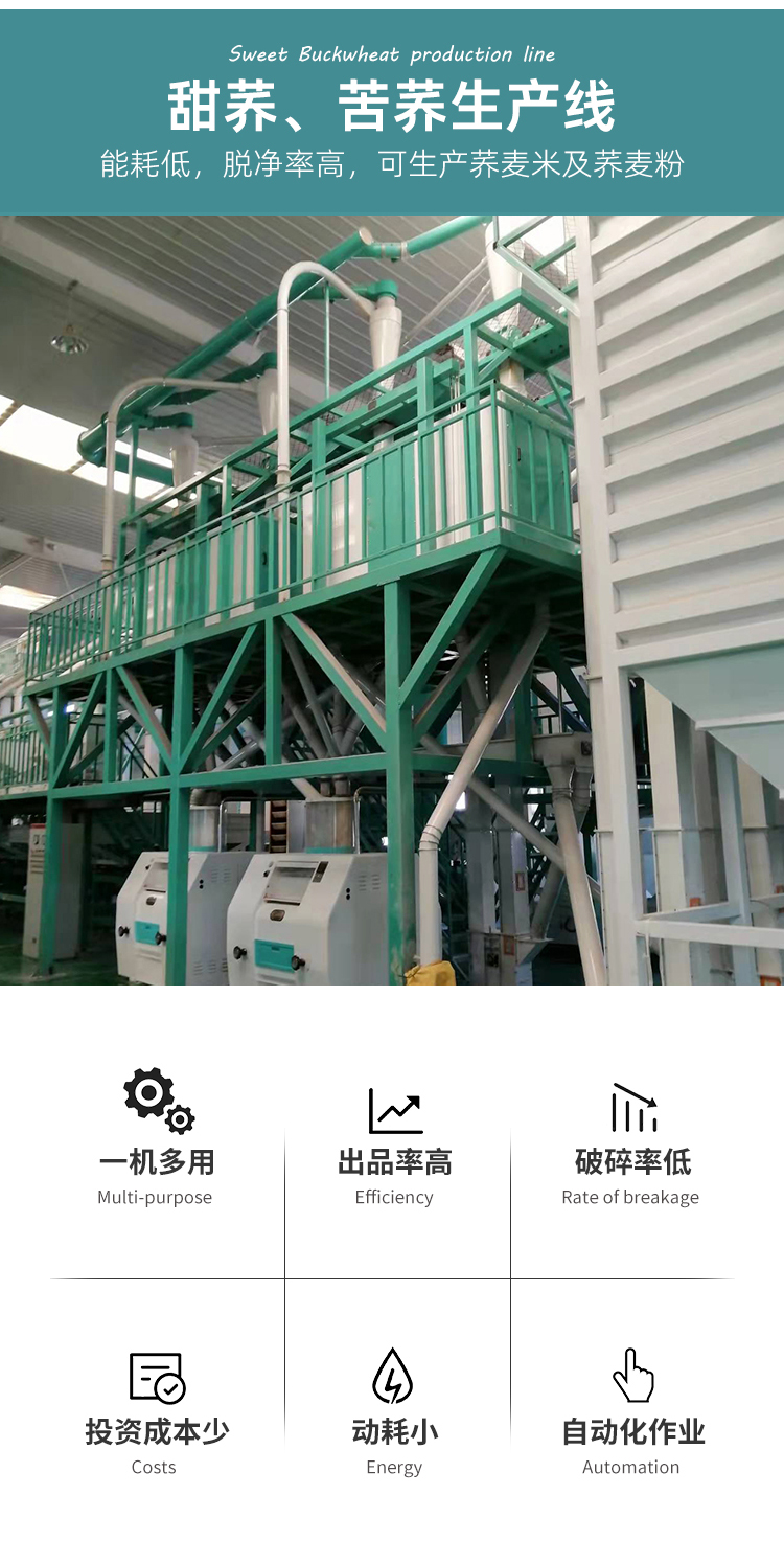 新型蕎麥加工設備的脫殼分選機組可對分級后的每個級別分別進行脫殼、除皮、一次未脫殼的子粒可自動返回脫殼機進行再次的脫殼。由于采用的是先分級后脫殼的方式,所以脫殼分選效果好、效率高、整米率高,且脫完的蕎麥殼是完整的。