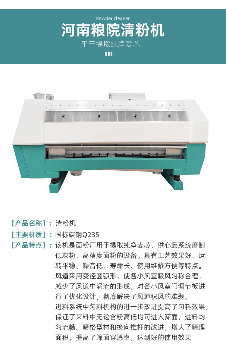 FQFD-A系列清粉機是小麥面粉加工廠的主要設備之 。它是利用篩理和氣流的聯合作用對麥渣、粗麥心、細麥心及粗粉等進行凈化提純,使物料按不同的品質及顆粒大小分 ,并去除其中的麩屑。從而達到對小麥麥心的分 提純,提高面粉的質量和出粉率之目的。