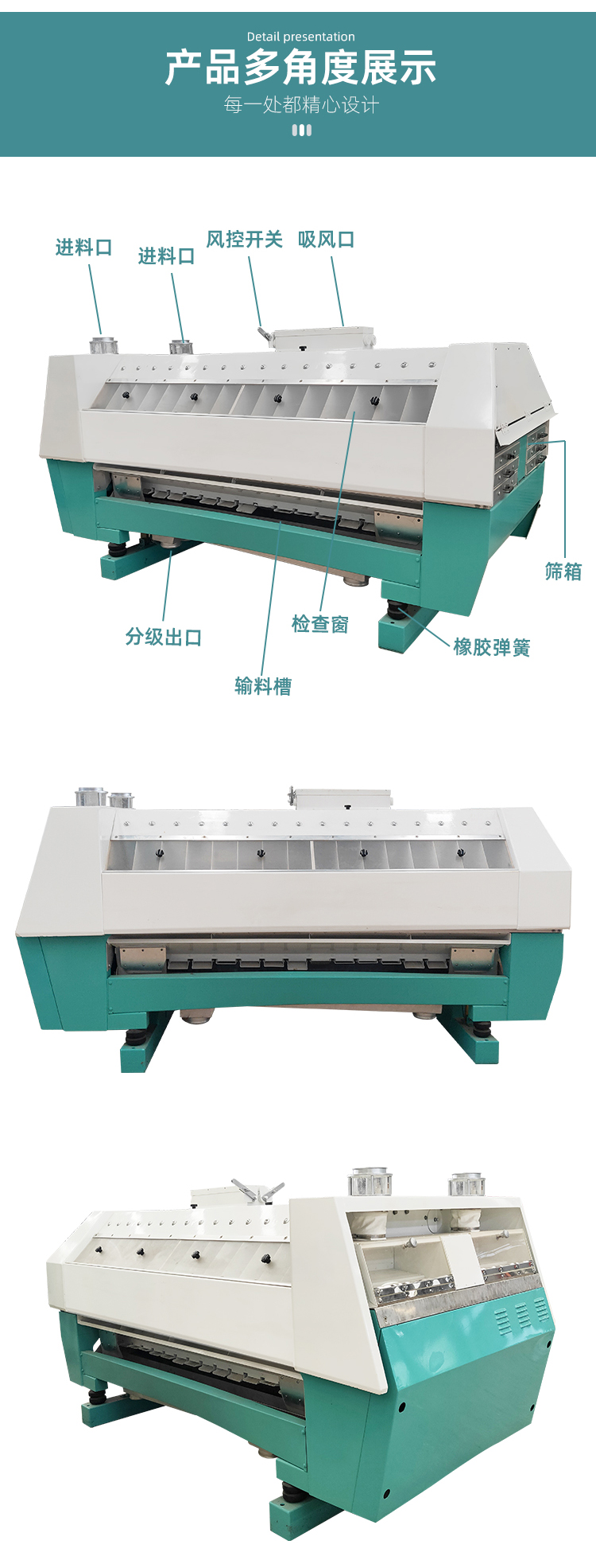 4、吸風系統設計先進,風道內積存粉塵少,不堵塞,風選效果好;