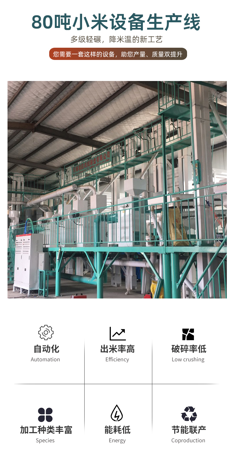該生產設備可加工原糧有粳性小米、糯性小米、黃小米、白小米、綠小米、黑小米、高粱米及香小米。可出成品為系列小米、高粱米、飼料。產成品小米、高粱米的得率高、色澤好、無雜質,適應市場需求,為客戶創造高的經濟價值。整套產品工藝先進、設備精良、專用性強、布置合理、動耗小、出品率高、成品質量好,廣泛應用于食品加工企業和糧食加工企業。